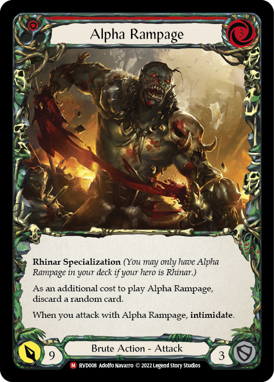 Rhinar Specialization (You may only have Alpha Rampage in your deck if your hero is Rhinar.) As an additional cost to play Alpha Rampage, discard a random card. When you attack with Alpha Rampage, intimidate.