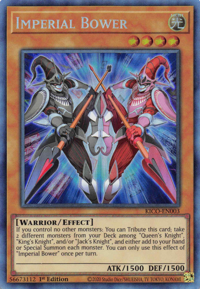 If you control no other monsters: You can Tribute this card; take 2 different monsters from your Deck among "Queen's Knight", "King's Knight", and/or "Jack's Knight", and either add to your hand or Special Summon each monster. You can only use this effect of "Imperial Bower" once per turn.
