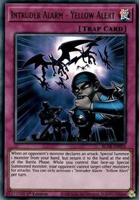 When an opponent's monster declares an attack: Special Summon 1 monster from your hand, but return it to the hand at the end of the Battle Phase. While you control that face-up Special Summoned monster, your opponent cannot target other monsters for attacks. You can only activate 1 "Intruder Alarm - Yellow Alert" per turn.