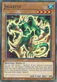 You can only control 1 "Jigabyte". If you control a Spellcaster monster, you can Special Summon this card (from your hand). When this card is destroyed by battle or card effect and sent to the GY: You can Special Summon 1 monster with 1500 ATK/200 DEF from your Deck, except "Jigabyte".