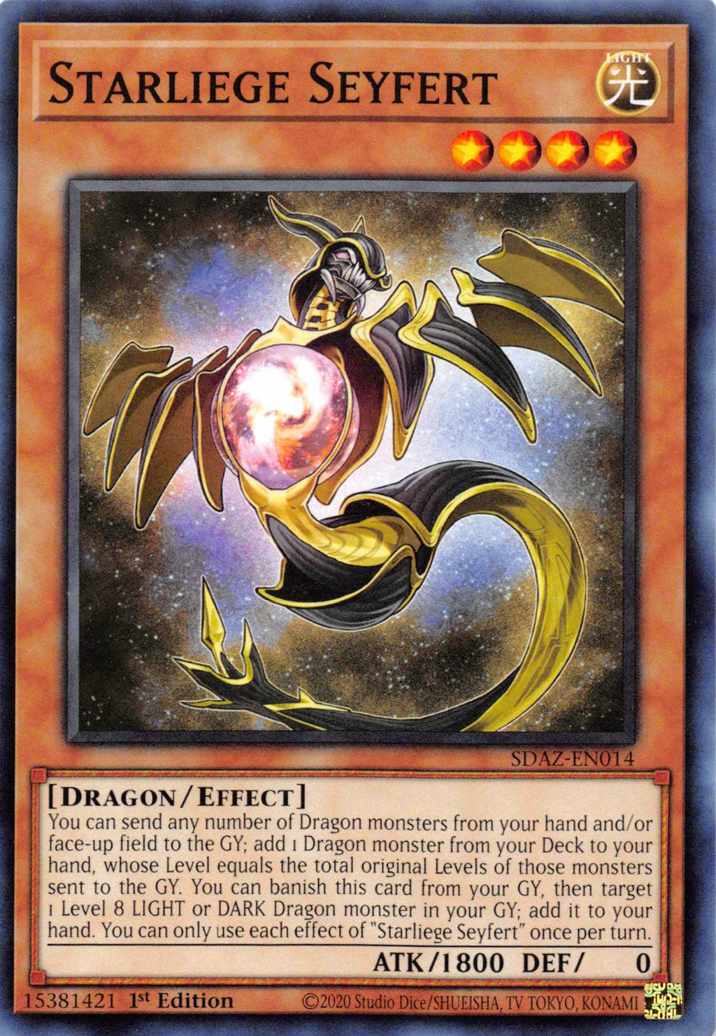 You can send any number of Dragon monsters from your hand and/or face-up field to the GY; add 1 Dragon monster from your Deck to your hand, whose Level equals the total original Levels of those monsters sent to the GY. You can banish this card from your GY, then target 1 Level 8 LIGHT or DARK Dragon monster in your GY; add it to your hand. You can only use each effect of "Starliege Seyfert" once per turn.