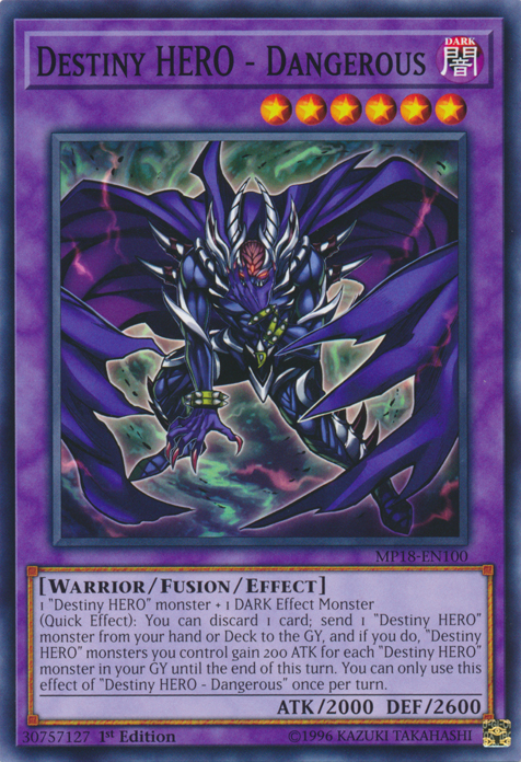 1 "Destiny HERO" monster + 1 DARK Effect Monster (Quick Effect): You can discard 1 card; send 1 "Destiny Hero" monster from your hand or Deck to the GY, and if you do, "Destiny HERO" monsters you control gain 200 ATK for each "Destiny Hero" monster in your GY until the end of this turn. You can only use this effect of "Destiny Hero - Dangerous" once per turn.