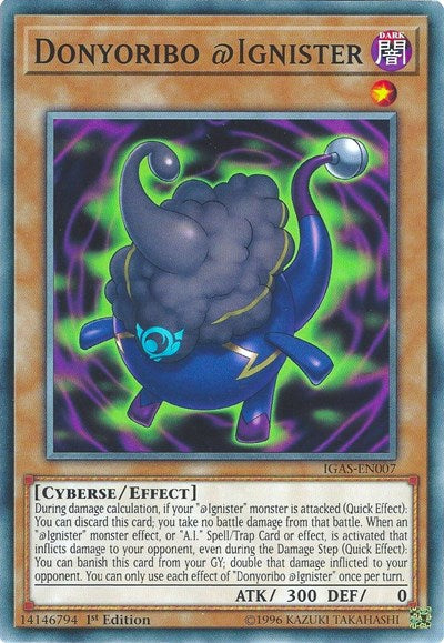 During damage calculation, if your "@Ignister" monster is attacked (Quick Effect): You can discard this card; you take no battle damage from that battle. When an "@Ignister" monster effect, or "A.I." Spell/Trap Card or effect, is activated that inflicts damage to your opponent, even during the Damage Step (Quick Effect): You can banish this card from your GY; double that damage inflicted to your opponent. You can only use each effect of "Donyoribo @Ignister" once per turn.