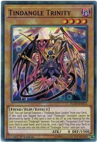 If this card is flipped face-up, your "Tindangle" monsters cannot be destroyed by battle while this card is face-up on the field. If this card is sent to the GY as material for the Link Summon of a "Tindangle" Link Monster: You can add 1 "Gergonne's End" from your Deck to your hand, then send 1 Spell/Trap from your Deck to the GY. You can only use this effect of "Tindangle Trinity" once per turn.